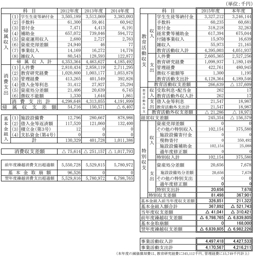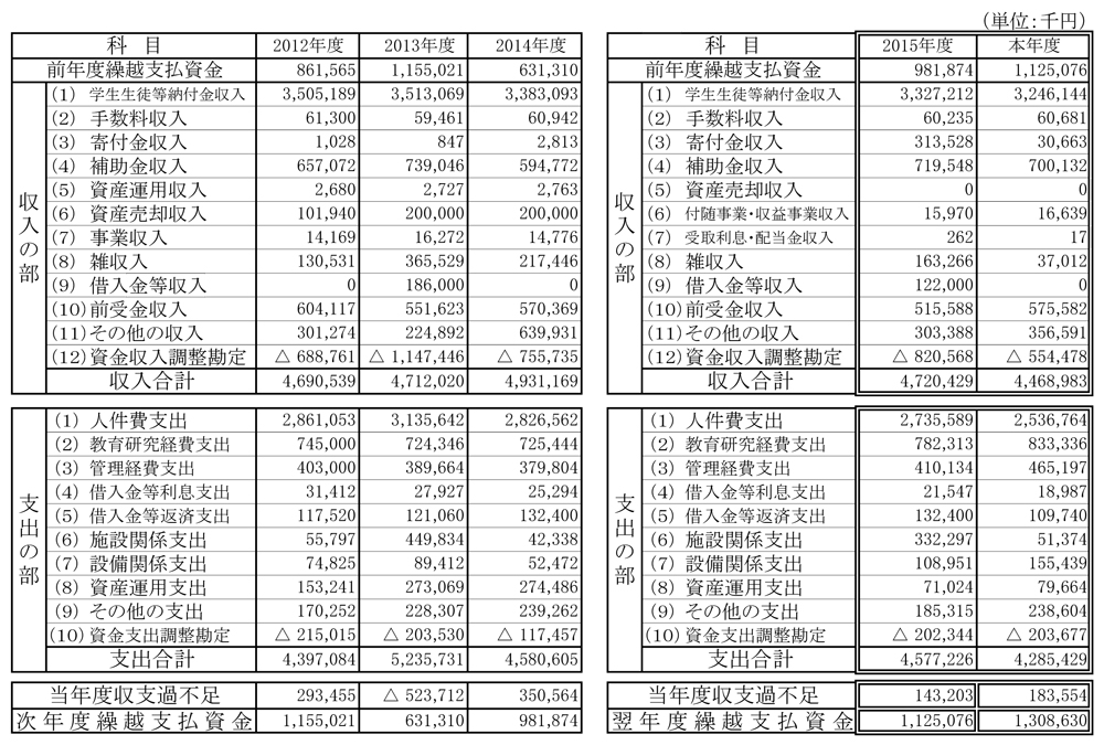 本年度の収入の部は、主に、「寄付金収入(282,865千円)」「雑収入のうち退職金財団交付金収入(128,540千円)」、「借入金等収入(122,000千円)」、「資金収入調整勘定のうち期末未収入金(211,309千円)」の減少などにより、251,446千円の減額となりました。